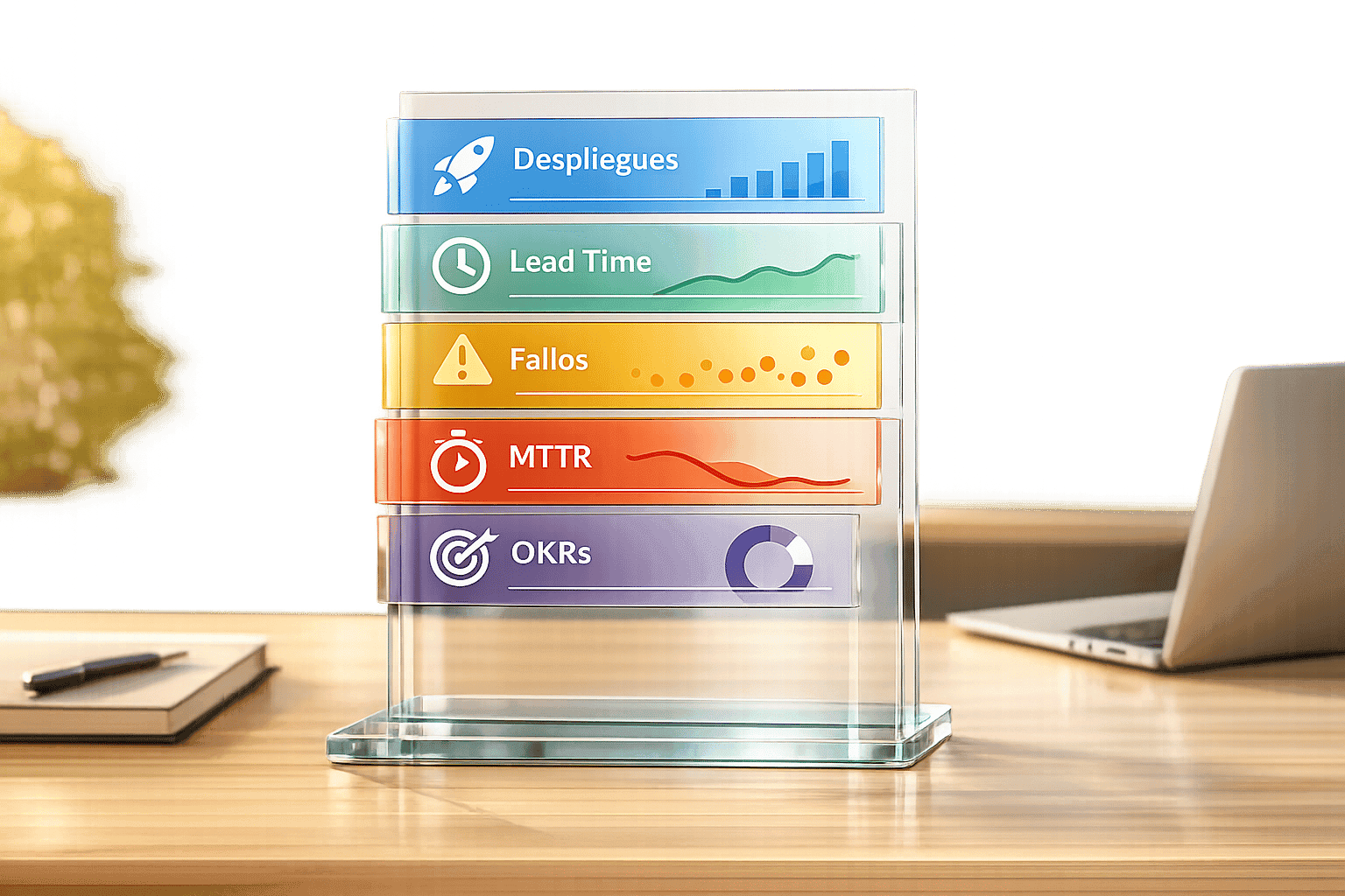 Cinco KPIs esenciales — frecuencia de despliegue, lead time, tasa de fallos, MTTR y OKRs — para medir eficiencia, estabilidad y alineación estratégica.